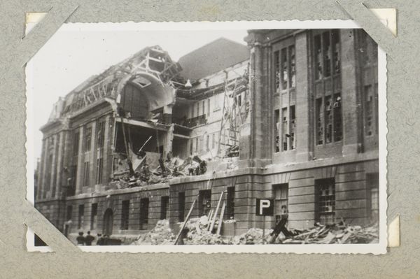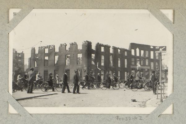 Editor: This gelatin-silver print, "Gezicht op de hoek Rederijstraat Boompjes met uitgebrande huizen," was taken anonymously sometime between 1940 and 1945. The burned-out buildings juxtaposed with people going about their day...it's eerie. How would you interpret this photograph? Curator: Formally, the photograph presents a stark contrast between the geometric regularity of the damaged architecture and the somewhat softer, more organic forms of the figures in the foreground. The grayscale palette, of course, flattens the scene, emphasizing texture and form. Note the photographer's careful placement of the horizon line, dividing the image roughly in half. What compositional elements stand out to you? Editor: The sharp angles of the buildings against the softer curve of the arches...and how the figures sort of echo the vertical lines. Is that intentional, do you think? Curator: Whether intentional or not, that interplay between line and form is crucial to understanding the photograph's power. Semiotically, the ruins signify devastation and loss, while the people suggest resilience and continuity. The formal arrangement emphasizes this tension. The light source appears to be behind the camera, illuminating the facades. How does that choice of light affect your interpretation? Editor: I guess it throws the destruction into sharp relief, no shadows to soften it. The people become more like silhouettes, part of the scene but also separate from the destruction itself. I had focused on the subject, but the form of this print has just as much to say. Curator: Precisely! And by analyzing that interplay, we achieve a richer understanding.