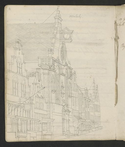 Curator: At first glance, the building in this pencil drawing conveys a sense of monumental calm, despite its sketchy quality. Editor: Indeed. What we're viewing is Johan R. Kruyff's "Ontwerpen voor de façade van een gebouw," a design for a building facade, created in 1865. The work reveals a strong engagement with Neoclassical architectural principles. Curator: Note how Kruyff uses geometric shapes to construct the facade, the repetition of arched windows on the ground floor that contrast with the rectangular ones above. It speaks to a balanced, rational design. Editor: Yes, and that rationality must be placed within the context of 19th-century urban development. The city was undergoing significant transformations, driven by industrialization and expanding populations. Designs like this one reflected a desire for order and control in the urban environment. Curator: I agree. The details on the upper floors, that small balcony, the decorative cornice...it's a visual language of power, communicating solidity and permanence through carefully considered architectural features. Editor: Also, the unfinished aspects offer a glimpse into the creative process itself. You can observe how different possibilities of arcades and ornamentation may have played out on the paper itself before the architect settled on this precise and rather elegant solution. Curator: The drawing exemplifies how architectural designs served as a means to assert civic pride and stability, expressing society's values through a structure's aesthetic form. Editor: And within its pencil strokes, this artwork also contains a rich sense of historical progress and confidence, and all that may entail. What a fascinating demonstration of lines! Curator: Precisely; the linear clarity here makes such a claim all the more engaging.