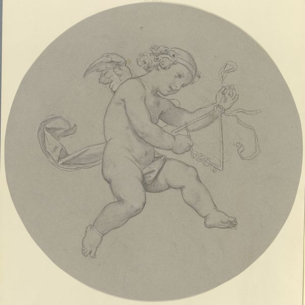 Editor: We're looking at "Genius med bue i venstre hånd og højre hånd hævet mod en kronet fugl" from 1843, a drawing and print by Andreas Flinch. I'm really struck by the central figure - they appear almost as part of the decorative floral elements surrounding them. What’s your read on this interesting figure? Curator: Well, it is indeed an intriguing image. In the context of 19th-century Denmark, think about the prevailing artistic conventions and nationalistic aspirations. Figures like this, combining human and natural forms, were often employed to symbolize abstract concepts, like genius or inspiration. The presence of the crowned bird elevates this beyond mere decoration, inviting reflection on power and its relation to creative spirit. What could this interplay between the “genius” and the bird imply? Editor: Perhaps the bird represents divine right or patronage of the arts by royalty? And the figure seems trapped by the flowers almost, so does it mean that "genius" is limited by circumstances? Curator: That is certainly a good consideration. How might the figure's ambiguous gender identity, or lack thereof, fit into socio-cultural power structures of the era? Editor: Interesting. It certainly challenges the conventional understanding of gender roles within the artistic scene and broader society of the time. Curator: Indeed, and such ambiguity can be interpreted as a form of social critique. The image prompts us to examine the role of the artist and muse during this period, challenging normative ideas about their relationship to society. The location in the SMK – Statens Museum for Kunst also solidifies this image’s placement in the established artistic lineage and the cultural value it brings. Editor: I never considered the figure's gender that deeply. That really expands my perspective on the piece! Curator: Examining artwork through a historical and social lens helps expose complex power structures we may not have initially recognized. It allows the artwork to continue resonating and educating viewers centuries later.