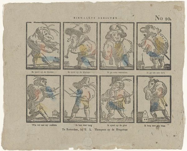 Editor: Here we have "Handel en bedrijf," or "Trade and Business," an engraving dating from 1806-1830 by Johan Noman. It depicts a grid of different merchants, each with a short descriptive verse underneath. There's a real simplicity to it – almost like a trading card sheet, or a primitive comic strip. What’s your initial take? Curator: What strikes me first is its honesty. It presents labor, trade, the daily grind of earning a living without any romantic fluff. You see the cucumber seller, the fishmonger, the man selling onions door-to-door, come rain or shine. It’s utterly relatable, and, in a way, poignant. What sort of narratives or meanings can you extract from this tableau of Dutch Golden Age society? Editor: Well, I suppose it’s interesting to consider the range of jobs depicted. It gives a snapshot into a certain class’s lifestyle – those who had to sell their wares directly to the consumer. It almost romanticizes the simple act of hard work in a humble tone. Curator: Yes, but are we imposing our 21st-century values onto an earlier period? The people who lived these lives might not have perceived them as “romantic.” There is an intimacy in knowing that it might feel like we've encountered such trades and faces still in this world! It challenges our concept of art, history, social order, and progress! Do you believe it shows more "work ethic" or necessity? Editor: I see your point! Probably necessity. It’s easy for us to look back with nostalgia, but these were real people facing real hardship. But perhaps the simple documentation gives value to people who weren't the wealthy patrons. Thanks for making me think differently. Curator: Absolutely. It also illustrates how much can be communicated without the pretension and fanfare, giving voice and meaning to lives that seem like looking in a nostalgic, yet revealing mirror.