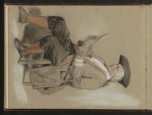 Curator: This work is by Cornelis Springer. It is called "Vrouw achter twee jongens" – translated as "Woman behind two boys". Springer likely made it between 1846 and 1882. Editor: My first impression is that it feels like a quickly captured moment, a sketch with the faintest wash of colors giving a casual sense. Curator: Indeed. Observe the confident application of watercolor. The artist doesn't fuss over details, but rather focuses on form and shape to capture the figures and spatial arrangement. The bold outlines articulate volume effectively and define the compositional space of the work, notice the strong use of diagonals. Editor: Those outlines carry echoes of the past. Look at the attire – it places us firmly in 19th-century Northern Europe. There is a peculiar gesture in the boy with the red sleeve, pointing perhaps to a hopeful future or towards a memory of a cherished, ideal place? The boys serve almost as cherubic symbols, as testaments of innocence, youth and curiosity. Curator: It's a complex dynamic isn't it? The standing figures are solid, while the outlined form to the right seems ephemeral. The contrast adds a certain vibrancy, a layering of visual information, which draws the eye across the picture plane. Editor: Perhaps that layering signifies the different dimensions of experience: The woman standing silently embodies stability, endurance. It reminds me of traditional family depictions, while these children stand for the ever changing flow of existence. They seem carefree, yet her solid presence is their quiet center. The color play emphasizes that division of being. Curator: It truly does ask about the structure of existence in such simple but beautifully balanced ways. This is something quite powerful achieved through line and limited hues alone. Editor: Agreed. It goes far beyond what we may assume is simply just a family portrait.