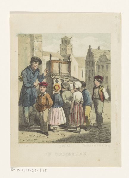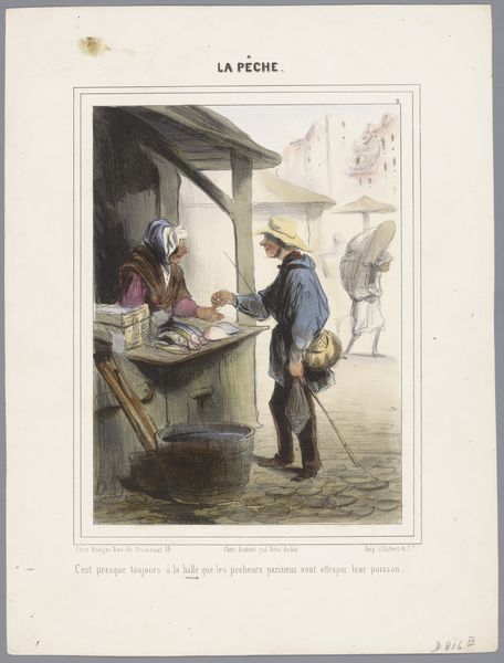 Editor: This is "Man comes from the market with a full shopping basket and goose" made between 1837 and 1843 by Charles Vogt. It looks like a print, maybe a lithograph. There's a distinct sense of everyday life. What catches your eye in this piece? Curator: I'm drawn to how Vogt uses the lithographic process. Consider the socio-economic implications: Printmaking democratized art. This wasn’t a unique oil painting for the wealthy, but a mass-produced image potentially available to a wider audience. How does the print medium influence our perception of this domestic scene? Editor: That's an interesting point! I was initially focused on the picturesque qualities - the market scene and the figures. But you're right, it's also about the reproduction of this image. Curator: Exactly. Look at the materiality of the lithograph itself: the paper, the inks, the methods of applying tone through various crayon techniques. What labor went into its creation, both artistic and industrial? The commercial aspect of Vogt’s work is something to consider. These images often circulated as advertisements. Editor: So, it's not just about portraying an everyday scene, but also about the everyday consumption and commercial life it hints at. Does the "goose," in particular, seem to embody this emphasis on material consumption and production? Curator: Precisely. The goose, held in hand, shifts from being a simple part of a "genre" scene to a product, a commodity. Also the market place itself embodies commodification as part of a narrative of a happy life. Does the image reflect societal expectations? Does the making of it also comment on the work done by women as they are situated near the market and house? Editor: I hadn’t thought of it that way, viewing it more as a charming domestic scene. Seeing it in terms of production and accessibility shifts my perspective quite a bit. Thanks, it’s definitely given me a new lens through which to see this piece. Curator: Likewise! It's important to look at how artistic processes impact the narrative and challenge traditional interpretations.