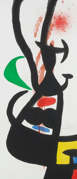Editor: This is Andy Warhol’s "Mickey Mouse" from 1981. The colors are so muted and the lines are really bold. What do you make of the composition, especially the choice of color? Curator: Immediately, I see the structural contrast. Warhol employs simplified forms and flat planes of color. Note how the interplay of the unmodulated, pale yellow background emphasizes the figure's graphic qualities, reinforcing the surface and denying illusionistic depth. Consider also the semiotic function of those colors; the muted tones clash slightly, yet create an immediate sense of 'readability', echoing the cartoon subject matter. Editor: So, the lack of depth and simple shapes are deliberate? To really emphasize the cartoon-like nature? Curator: Precisely. Moreover, the red outline around the grayscale Mickey isolates the form and flattens it further, reinforcing its status as a sign, as a universally recognizable cultural icon stripped bare of emotional complexity. What philosophical framework might explain Warhol’s method? Editor: Maybe something about the end of painting, or reproducing the world instead of creating something new? Curator: Intriguing, the surface flattens the image, negating emotional depth for pure graphic impact. How do you interpret the use of the slightly 'off' colour registration? Editor: It almost looks like a printing error, which feels very modern. As if mechanical reproduction isn’t perfect, or maybe isn't meant to be. Curator: Indeed. Such visual disruption exposes the underlying structure of mass production. That’s very insightful, seeing the layered significance in seemingly simple aesthetic gestures. Editor: Thanks! I see so much more now by focusing on just the shapes and colours themselves. Curator: The visual syntax reveals an entirely new context. Now, how might we apply this knowledge of form and structure to his other work?