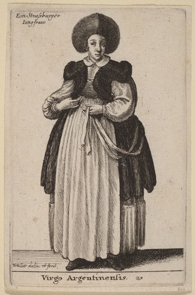 Curator: Oh, there's a subtle coolness to this piece, wouldn't you say? It's an engraving, "Mercatoris Parisiensis Vxor," created back in 1643 by Wenceslaus Hollar. The detail in the folds of the fabric, the way she holds herself... Editor: Yes, an air of poised austerity certainly resonates. Looking at this portrait, I see far more than a mere representation of a Parisian merchant’s wife; I perceive a reflection of Baroque society's complex stratification and gender roles. Curator: Right? I'm fascinated by the way Hollar uses these precise lines. I almost feel I can touch the stiff collar and the weight of that impressive skirt. It’s almost tactile, isn’t it? Like she is here in front of us. I can sense that woman, if you know what I mean. Editor: Indeed. The emphasis on the material—the clothes, specifically—speaks volumes. The sumptous details served as explicit markers of social standing. How power and wealth are materially embodied and performed within 17th century European culture. This meticulous detail also exposes gender as a construct. Curator: But there's something more personal here too. The way she gazes, almost confrontational. There’s strength, a little melancholia, a secret kept under all the heavy fabric. Do you feel it? It is her eyes that draw me to the artwork again and again. Editor: Precisely. Her controlled demeanor masks a vulnerability endemic to the patriarchal structures of that period. Her identity is literally inscribed through the name of her husband in the artwork's title. How much is it hers? And what has she had to forsake? It is really impossible to look at the artworks through innocent eyes. Curator: True. So much unseen in plain sight. Looking closely feels almost like unearthing forgotten stories... I think it gives a strange vibration... and how does it interact with ours. Thank you, really, this painting has more inside than outside. Editor: My pleasure! Art provides spaces to recognize structural norms of a certain moment. And this exercise can transform the way we apprehend our present and possible futures. Thank you.