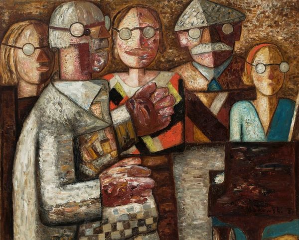Charles Blackman made this painting called 'Parade' with what looks like oil on canvas, and the first thing I notice is how the colours create a sort of stage-like space. It’s all greens and blacks, and then suddenly these figures burst out with reds and yellows. The paint is applied pretty thickly, and you can see how Blackman uses these heavy strokes to build up the characters. There's a wonderful tension between the dark, almost oppressive background, and the vivid figures. Look at the orange shape on the left, it’s so solid, almost like a building block, but then it’s balanced by the softer blues and the more fluid black lines around it. It’s like he's building a world, not just painting a picture. Blackman’s work reminds me a little bit of Paula Modersohn-Becker, that raw, honest approach to painting. Ultimately, this piece feels like an invitation to step into a world where things aren't quite as they seem. It’s less about seeing, and more about feeling, you know?