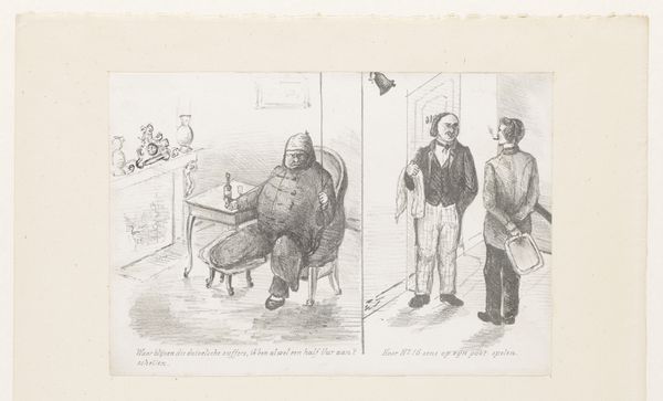 Curator: The image before us, housed here at the Rijksmuseum, is entitled "Bediende bij boze gewonde man," or "Servant with angry wounded man" if translated. It is believed to be created between 1864 and 1902 by Jeremias Adriaan Adolf Schill using pencil on paper. Editor: Oh my, what a compelling scene, even in its sketched state! There's so much implied tension in this relatively small work. The servant's stance radiates anxiety and a desire to flee, and I'm particularly interested in his placement relative to the wounded man. What exactly has occurred? Curator: I'm drawn to that very question! We see the seated figure, presumably the 'boze gewonde man,' next to what looks like a bedside table adorned with an opened bottle and glass. There are suggested symbols of domesticity contrasted with a state of disarray and likely, physical injury given the work’s title. I wonder what we can read into this relationship with service and potential discord between individuals. Editor: Precisely! The objects almost speak to an overturned power dynamic, or maybe a disruption of the norm for that time. While domestic genre paintings were often used as propaganda to signal social codes, here the reading becomes complicated by what might have led to the seated gentleman’s state of agitation. Do we have other depictions of servants by this artist, I wonder, so that we might interpret what kind of social reading to pursue? Curator: Not that I’m immediately aware of, no. I'd hesitate to label it typical 'genre painting' precisely *because* of the palpable sense of interruption and ambiguous narrative that resist any concrete story. It makes the cultural reading so much richer in terms of the role of art and societal expectation. Editor: Right, the drawing offers instead a glimpse of unfulfilled promise of social balance, making one think not just of the social milieu when it was rendered, but perhaps of historical themes relating to the dynamics between social classes generally. Curator: That interruption, I suspect, lies at the heart of the drawing’s cultural force. It holds an unresolved drama— Editor: An image offering a quiet study on the fragility of social relations, it would seem. Curator: Agreed. And what more could one ask from a drawing than a question to turn over and over in one's mind?