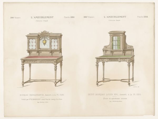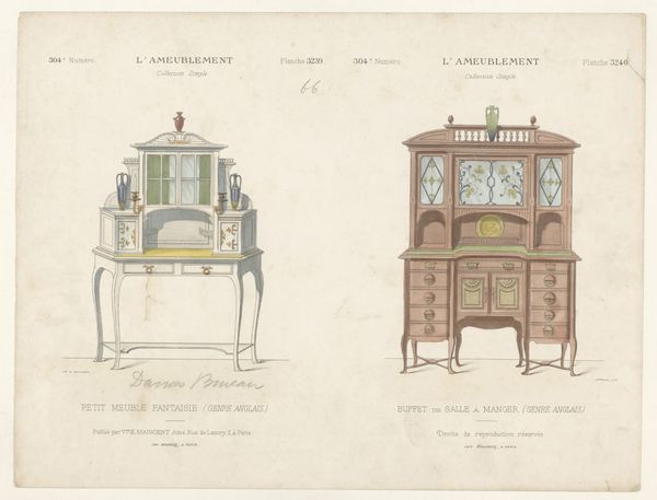 Curator: My initial impression is one of almost ethereal lightness, considering we're looking at furniture. The lines are so delicate, it feels like gazing at an architect's dreamscape more than utilitarian objects. Editor: Indeed. Here we have L\u00e9on Laroche’s “Buffetkast, tafel en kast” created around 1895. It's a print showcasing Art Nouveau furniture designs, part of a broader movement reflecting societal shifts. Curator: Art Nouveau often symbolized a yearning for escape from industrial drudgery, didn't it? Looking at this piece, the emphasis on the organic, almost gothic details feels like a direct rejection of factory uniformity. Editor: Absolutely. We can delve into the labor involved in crafting such intricate designs. Imagine the highly skilled artisans needed to translate these drawings into tangible, functional objects. Curator: It prompts us to question the lives intertwined with these designs – who commissioned them? Who were these artisans, and what were their working conditions like? The floral motifs and sinuous curves perhaps speak to feminine ideals of the era. How does the object either challenge or reinforce class structures, the patriarchy or colonialism? Editor: Precisely. We need to explore the socioeconomic contexts and consumption patterns that enabled this kind of production. Art Nouveau pieces, like these, weren't merely aesthetic statements. Curator: It’s a negotiation between function and fantasy, between the rising tide of industrialization and nostalgia for handcrafted beauty. This artwork embodies social, artistic, and historical intersections that remain very much in play today. Editor: I agree. By focusing on Laroche's materials, his means of production, and considering their context within broader economic trends, this seemingly simple print opens a rich field for future discussion and reflection.