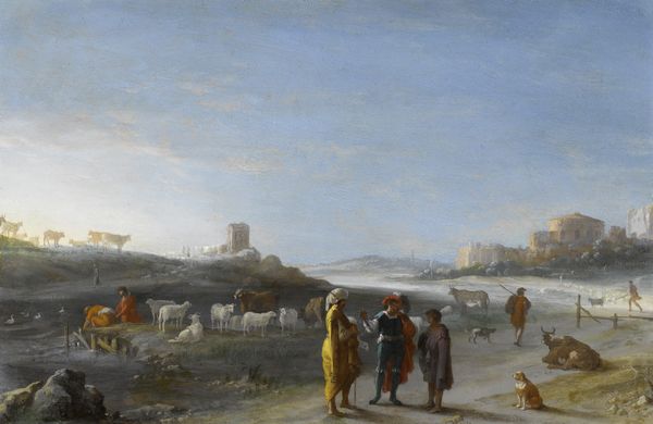 Rembrandt van Rijn created this compelling oil on panel, "Winter Landscape," amidst the Dutch Golden Age, a period marked by unprecedented economic prosperity and cultural flourishing in the Netherlands. Yet, this period also coincided with stark class divisions. The painting offers a glimpse into the lives of ordinary people during winter. Note the figures scattered across the frozen landscape: some are idle, some are carrying burdens. The tension between stillness and movement, ease and labor, evokes the social hierarchies of 17th-century Dutch society. Rembrandt, deeply interested in the human condition, often depicted scenes of everyday life, choosing to represent the emotional and personal dimension of his subjects rather than idealizing them. This landscape, with its muted tones and subtle details, captures the quiet resilience of people navigating through the harshness of winter. The artwork serves as a poignant reflection on the lived experiences of individuals within a specific historical context, inviting us to consider the human stories embedded in the broader narrative of history.