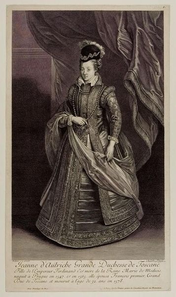 Curator: There’s something so immediate about this portrait. Jeanne d'Autriche, Grande Duchesse de Toscane. She feels formidable. Editor: Absolutely. Given that Gérard Edelinck, who was born in 1640, made this piece, we can appreciate it as a fascinating document reflecting both the sitter and the social hierarchies of her time. The dress alone speaks volumes. Curator: It's like a wearable fortress! All that embroidery, those layers. It must have weighed a ton. I wonder if she ever just longed for some comfy pajamas. Editor: Doubtful! But thinking about the garment as armor allows us to explore Jeanne's role in solidifying Habsburg power through marriage. It’s less about comfort, more about projecting dynastic strength. Curator: Right, and it's interesting how Edelinck captures that. The slight tilt of her head, the controlled expression—she knows she's being looked at, and she's ready. Editor: Exactly. It’s a portrait that uses classical tropes to broadcast a very specific message about lineage, gender, and power. Curator: Makes you think about all the things we wear to say things without actually saying them. Editor: Precisely. These early portraits can be incredibly illuminating windows into the past.
