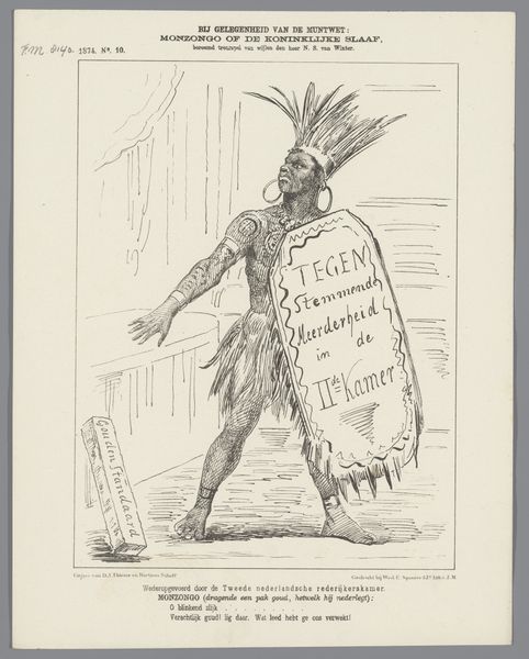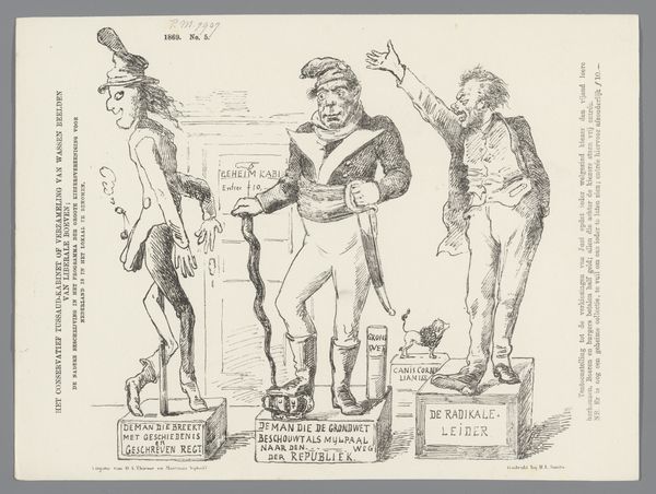 This is a print made in 1877 by Johan Michaël Schmidt Crans. It immediately strikes you with its sharp, wiry lines which define two figures in military garb. These figures dominate the composition. Their exaggerated features and postures suggest a narrative steeped in critique. Schmidt Crans employs line not merely to depict, but to dissect and convey. The starkness of the black lines against the white paper creates a high contrast. This enhances the visual tension and draws attention to the grotesque caricatures of the generals, destabilizing any sense of their authority. The print challenges the valor typically associated with military figures. The artist engages with a broader discourse on power and representation, inviting us to question established values through its unsettling yet deliberate composition. This function highlights art's role not as a fixed statement but as a dynamic site for questioning and interpretation.