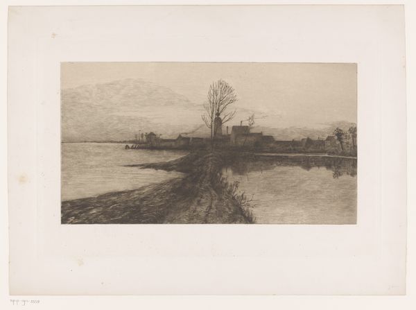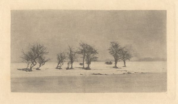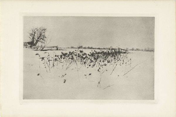 Curator: Upon initial viewing, what strikes me most is the quiet stillness that the artist, Peter Henry Emerson, captures in "Sneeuwlandschap", a gelatin-silver print made sometime between 1890 and 1895. Editor: It really does evoke a particular feeling, a somber sort of peace that I often feel during the colder months. It reminds me how class and gender greatly impacts lived experience, since winter hits the impoverished so hard, stripping them of what little they have, safety, and sometimes even community, as their homes disintegrate in the landscape due to neglect and limited social resources. Curator: Well, Emerson, being a key figure in Pictorialism, would likely appreciate your feeling oriented toward personal expression, a key value of the movement, even if perhaps not expressed precisely in those activist terms. The process was manipulated in development. We should ask, how does that pursuit affect our understanding of what the photograph “documents?” Editor: Absolutely! Considering that many Pictorialists worked to counter ideas about art and craft, seeing photography elevated to the fine arts provided visibility to marginalized communities that sought representation to counter predominant oppressive norms. Curator: Right, it’s vital to understand Pictorialism emerging from the late 19th century Photo-Secession movement in America. It’s not only an attempt to establish photography as an art form. Note, for example, how he frames this snowy landscape scene in a manner clearly inspired by Impressionist landscape painting. This demonstrates, photographically, something we now take as normal but that, in that era, constituted a statement of cultural and artistic values. Editor: So, how might such an approach serve social reform? How did this type of visual narrative shift cultural ideologies towards human liberation in late nineteenth century landscapes and urban contexts? Emerson uses his photography in pursuit of an artistic vision, though the context could invite important discussions about wealth, access and environmental inequality at that moment. It opens a space to think more critically. Curator: I completely agree! It’s essential we don’t look at historical artwork in isolation. Considering broader issues relating to representation, agency and enfranchisement allows us to engage more fully and deeply. Editor: Absolutely! Thank you for lending your invaluable insights, helping us create meaning beyond initial perspectives.