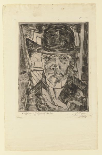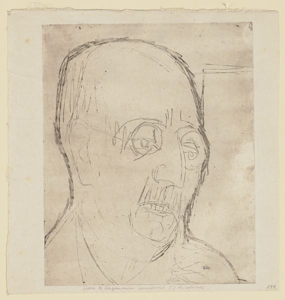 Editor: Here we have Ernst Ludwig Kirchner's 1920 etching, "Kopf Dr. E. Grisebach," or "Head of Dr. E. Grisebach." It’s a striking portrait, and the stark lines and shading create a really intense, almost troubled mood. How do you interpret this work? Curator: Well, let’s consider the social and political context. This was created shortly after World War I, a period of immense trauma and societal upheaval in Germany. Look at the sharp, angular lines – do they perhaps reflect a sense of anxiety, a fracturing of the self that mirrors the collective experience of the time? The German Expressionists, including Kirchner, often used art to critique and question bourgeois society and explore trauma after the war. Do you think that Expressionism fits here? Editor: I see that. The sitter's gaze seems almost accusatory, doesn't it? Perhaps directed at a society that failed so many. It also has me wondering if the class of the sitter – a “Dr.” – played a role in the artwork. Curator: Absolutely. The portrait can be interpreted as a broader statement on power, class, and the responsibility of the intellectual elite. Did they do enough to prevent the war? What role did they play in shaping the social landscape? Think of Kirchner's own struggles with mental health, too, perhaps reflecting how individuals felt burdened and disillusioned by the state of things. Editor: So, it's not just a portrait of an individual, but a reflection of the collective anxieties and societal critiques of the era? Curator: Precisely. Kirchner uses the individual to address broader cultural and political questions. It also becomes clear how art can both reflect and shape discourse during social turmoil. Editor: I never thought about the potential dialogue between class and the artist's state of mind before when looking at Kirchner. Curator: And seeing the artwork in relation to social turmoil illuminates aspects we might otherwise have missed.