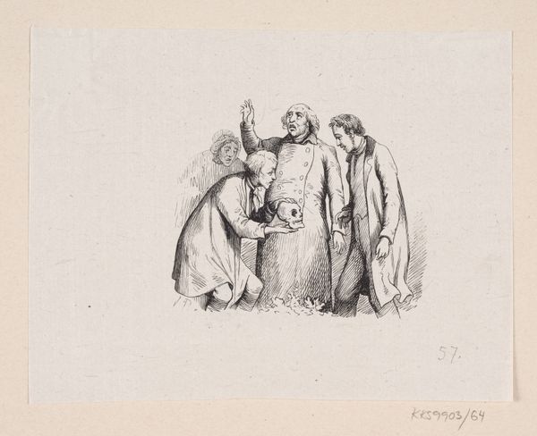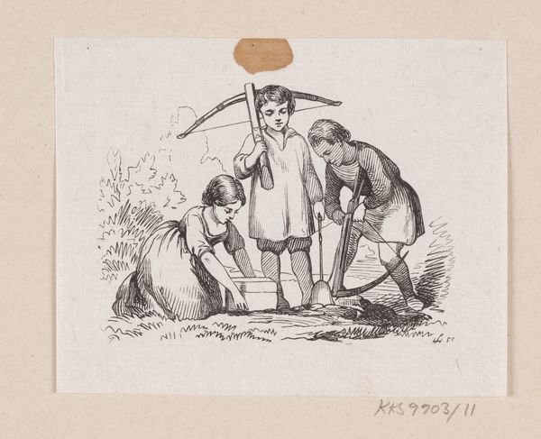 Editor: So, this is H.P. Hansen's illustration for Hans Christian Andersen's "The Darning-Needle," created between 1870 and 1873. It's a pen and pencil drawing, quite detailed for its small scale. The image is dominated by four boys intensely observing something on the ground. What strikes me is the focus on this seemingly mundane scene. How do you interpret this work? Curator: Well, seeing this piece through a historical lens, it becomes an interesting snapshot of social dynamics and the function of illustration in that period. The Andersen story, and therefore this image, aims at a broader audience that relies on the written and the visual message, usually promoting moral messages. How does this composition direct our gaze? What power dynamics are subtly embedded in the image, do you think? Editor: I see what you mean about power dynamics. It seems like the kneeling boys are maybe working at something, perhaps fixing their toys or something along those lines, and their relationship and position, and gazes almost suggest the need for supervision, mentorship perhaps... Is that something that Andersen, or the artwork wants to evoke? Curator: Precisely. And who commissions this work? What kind of cultural values might they want to reflect and promote? This artwork would have lived amongst the popular imagery and the narratives and lessons they offer on societal functions and class behaviours. The illustration served a clear purpose beyond mere decoration, participating actively in the shaping of young minds. Editor: So it is less about capturing the moment of child's play and more about reflecting specific social values through it? It's interesting how illustration at the time, it's such a reflection of societal intent. I hadn't considered that so deeply before. Curator: Exactly! Looking at art through its socio-historical context unveils a wealth of information about the values, ideologies, and power structures of its time. I think that applies very well to this piece. Editor: Definitely changes my view on what seemed like a simple illustration initially. Thank you.