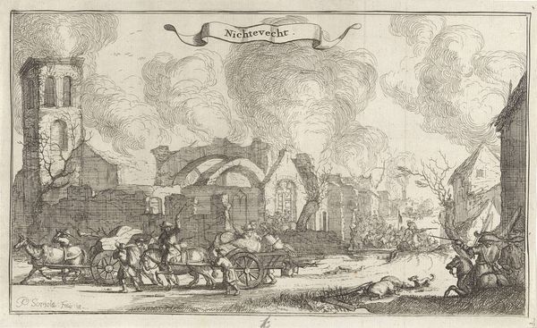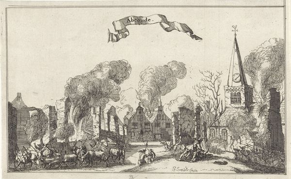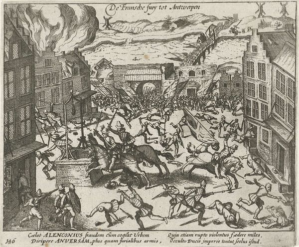Curator: What a striking image of chaos. Tell me, what’s your first impression of this engraving? Editor: Immediate, visceral – it evokes a sense of impending doom and frenetic activity. The composition feels crowded, almost claustrophobic, with the towering flames and collapsing structures. It's titled "Firemen Extinguishing a Burning House on a Market Square in Haarlem", an engraving from around 1681-1740 by Isaac Vincentsz van der Vinne. Curator: Indeed. Note how the artist utilizes a tight network of lines to articulate form, light and shadow – there's a high degree of contrast to give this image a visual energy. The orthogonals of the buildings give us an overwhelming feeling of collapse even as they obey formal geometry. Editor: I agree. And, speaking iconographically, fire often symbolizes purification and destruction, of course, but it can also represent enlightenment. Considering the Dutch Republic's history, perhaps the flames serve as a reminder of societal vulnerability, but equally symbolize resilience and rebirth in the face of adversity. Curator: Possibly, but notice how the architecture is presented; each structure becomes a vertical plane upon which lines trace the building's anatomy. What strikes me further is the interplay between form and content - observe the contrast in scale between the flames and the tiny human figures. This juxtaposition seems intentional. Editor: Van der Vinne seems preoccupied with symbols and implied narratives. The people scurrying around – each face, a miniature portrait of desperation and teamwork. The horse cart struggles, laden down with water, symbolizing collective effort and survival. Curator: You know, for me, while these human figures may hint at these concepts, these remain representational bodies integrated into a whole visual dynamic - these forms build a compelling narrative. Editor: Ultimately, the genius of this engraving is its ability to capture, within a rigid frame, not only the external devastation of a fire but also a potent commentary on the Dutch Republic's capacity for solidarity when up against great dangers. It gives one pause, doesn’t it? Curator: Yes, the linear density really communicates the event effectively.