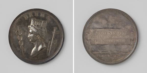 Editor: Here we have "Opening van de sluizen van de Rijn te Katwijk 1807", created in 1807 by Jean-Pierre Droz. It appears to be a bronze relief. It strikes me as very neoclassical in its composition and subject matter. What aspects of the work do you find most compelling? Curator: Its meticulous composition offers an intriguing interplay of geometric forms and figurative elements. Note how the artist employs the circular format, creating distinct zones of information through a clear division between text and image on either side. Editor: I see what you mean. Can you tell me more about how the visual structure guides our understanding of its subject? Curator: Absolutely. The allegorical figures on the right, seemingly referencing classical antiquity, present a stark contrast to the architectural depiction on the left. How does this contrast function visually? Consider the crisp lines of the building compared to the dynamism of the figures. Editor: I suppose that the geometric lines imply modern engineering while the classical figures represent the grand scale and historical importance of the feat. The contrast clarifies the difference. Curator: Precisely. The strategic use of line, form, and texture reinforces the duality. And observe the inscription encircling the figural group, framing it conceptually and aesthetically. Editor: The visual analysis makes the meaning more comprehensible than reading alone. Thanks for the perspective! Curator: My pleasure. By focusing on the visual vocabulary, we gain a deeper understanding of the work’s internal logic and intended effect.