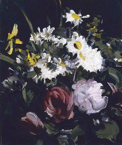Editor: This is Isaac Levitan’s "White Lilac" from 1895. It's an oil-on-canvas piece currently residing in the Omsk Regional Museum of Fine Arts. The textures seem really prominent, like you could almost reach out and touch the flowers. How would you interpret the impact of his formal choices? Curator: Observe how the composition emphasizes the contrast between the voluminous, light-filled lilac blossoms and the dark, almost somber background. Notice also the striking interplay of impasto and subtle glazing in rendering both the flowers and the vase. This careful arrangement intensifies the textural contrast and guides the eye, doesn’t it? Editor: It definitely does! The impasto makes the lilacs pop, while the glazing gives depth to the vase. Is the artist trying to convey some sort of message with that contrast? Curator: Perhaps, but I'd first like you to focus on what he has created here through surface, form and color alone. Consider how the restricted palette contributes to the overall mood. Does the limited chromatic range enhance or detract from the impact of the brushwork itself, would you say? Editor: I see what you mean! It amplifies it! Because of that stark contrast, it isolates the viewer, doesn't it? This might also affect our impression of time here. It looks very deliberate now that you pointed it out. The flowers are illuminated against an ambiguous and dark backdrop. Curator: Precisely. This work uses purely formal means to create emotional resonance. Its enduring power resides in that interplay between material and composition. Editor: I see this painting in a totally different light now. Thank you. Curator: Indeed. Close analysis reveals its complexities; appreciating formal decisions can deepen our appreciation for a painting, like this very image, overall.