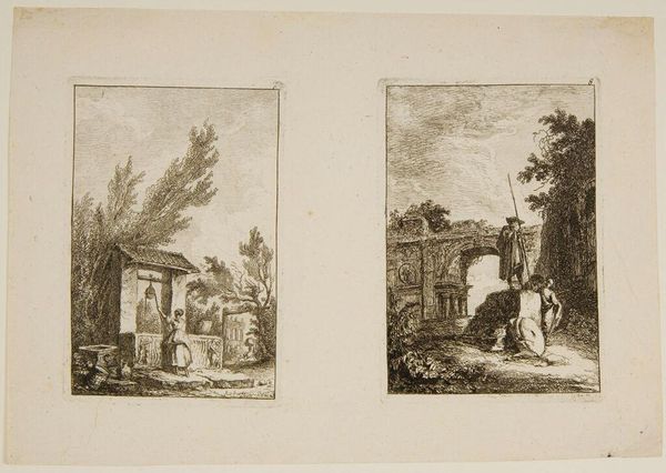 Curator: This print, created between 1612 and 1652 by Claes Jansz. Visscher, is titled "Huis Kostverloren / Landweg bij Amstelveen / Mijlpaal bij Sloten," which translates to "House Kostverloren / Country Road near Amstelveen / Milestone near Sloten." It’s an engraving in ink on paper, showcasing three distinct landscape vignettes. Editor: Immediately, I'm struck by how matter-of-fact these scenes are. There’s a real dedication to recording the material realities of the Dutch countryside, wouldn't you say? Each image is compact, efficient. Curator: Precisely! These are not idealized landscapes, but rather representations of specific places within broader historical and social currents. Think about land ownership, class distinctions visible in clothing, even the rise of a mercantile society demanding efficient infrastructure reflected in the road by Amstelveen. Editor: Yes, that road itself is significant! Consider the labor involved, the resources expended in its construction. It's a testament to the changing economic landscape, the infrastructure required for the burgeoning trade networks. The Milestone anchors this piece and highlights trade practices, in that these markers dictate not only physical progress but can be symbolic for financial. Curator: Absolutely. And looking closer at "Huis Kostverloren," the ruined state of the building may comment on changing fortunes, the transience of wealth and power. The building becomes a metaphor for societal transformations, almost mirroring contemporary debates around wealth disparity and access. Editor: It’s also interesting how Visscher utilizes the engraving technique itself. The density of lines suggests a dedication to the work. Also to reach such small precise etching on small material of copper is truly the hands and time for making a wage as a skilled worker and not as one born into privilege. Curator: These images are fascinating windows into a past where the land was undergoing immense changes, its spaces becoming increasingly defined by property lines, trade routes, and emergent class consciousness. Editor: Agreed, reflecting on this work brings the material reality and historical implications to life. The work serves to allow us to look into society’s structure and place within an evolving social framework.