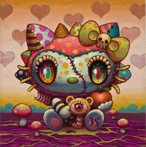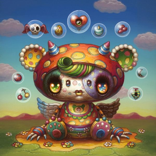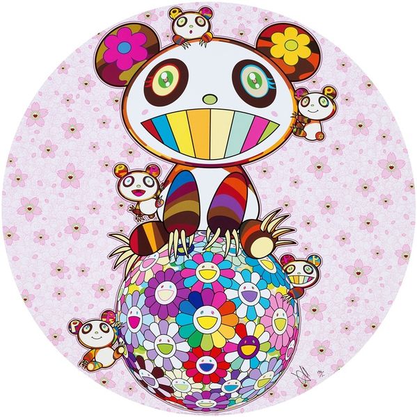 Editor: So, here we have Takashi Murakami’s “A Panda Family Against the Blue Sky,” from 2014. It seems to be a mixed-media piece with a huge, cartoonish panda towering over a mound of colorful skulls. It’s kind of… jarring, with that mix of cute and macabre. What’s your take on this work? Curator: Well, this piece, like much of Murakami’s output, operates in the complex space between pop art, postmodernism, and Japanese tradition. Consider the historical context. Post-war Japan saw a huge influx of American pop culture, particularly through animation and consumer goods. How do you think that shaped Murakami’s generation of artists? Editor: I guess they were absorbing and reacting to these outside influences? Curator: Exactly. And Murakami takes these seemingly simple, “cute” forms – the panda, the smiling flowers – and juxtaposes them with darker imagery, like the skulls. The bright colors and flat, almost digitally-rendered style borrow from pop art aesthetics. But there's also a link to the history of ukiyo-e prints in his embrace of commercial aesthetics and mass production. He challenges the traditional art world and blurs boundaries between high and low culture. Where do you think Murakami sees the public role of art? Editor: Maybe as something more accessible, more engaging with everyday life, instead of being confined to museums? But, also to hint at anxieties beneath the surface? Curator: Precisely. And the panda, a symbol of China, further complicates the image, raising questions about cultural exchange and global anxieties. Notice also how he uses recurring motifs to create a distinct brand identity that can be seen in museum and galleries. What do you make of that? Editor: It's kind of a statement in itself about art in the modern world, right? Curator: It is! Murakami definitely makes you think about how art circulates and what power that holds. I learned something about seeing his works in the current exhibition, so, thank you. Editor: Yeah, thinking about it as a response to cultural shifts makes it way more interesting than just a “cute” picture. I hadn't connected his repetition to a sort of "brand," either!