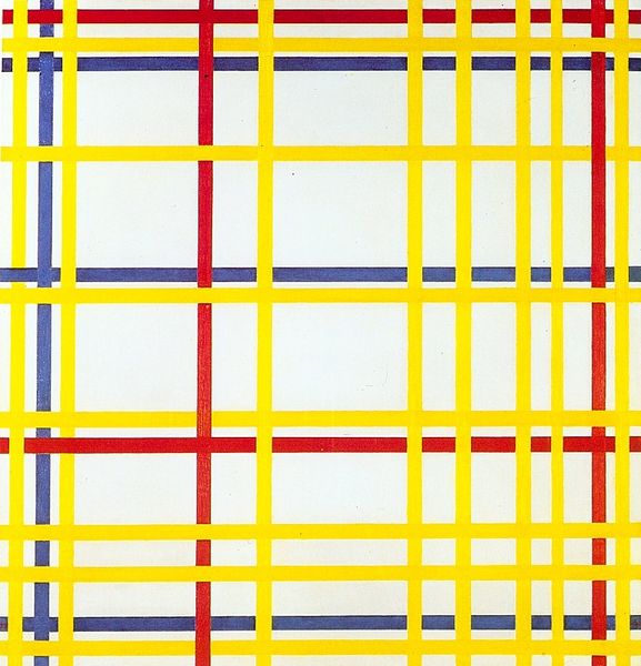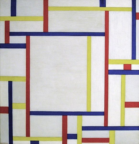 Curator: This is Piet Mondrian’s "Place de la Concorde," painted in 1943. It’s an acrylic on canvas, very much in his signature De Stijl style. Editor: My first impression? It’s… optimistic, I guess? Like looking at city grids but with a lightness that defies the seriousness of city planning. There's something so utterly pleasant about the composition here, and that yellow just sings. Curator: Indeed. It's important to remember the socio-political context. Mondrian created this during wartime, while exiled in New York. It’s a radical form of abstraction but speaks to the human desire for order and balance in times of chaos. The painting suggests hope. Editor: Right, but it's like controlled chaos, you know? He wasn't just throwing colors onto canvas; each line and color placement feels so deliberate, but I am almost overwhelmed by the possibilities each decision holds. Almost anyone can look at it and decide to continue his color game elsewhere, the image inspires creative game. Curator: Well, Mondrian's artistic theories aimed at the reduction of form to its most basic elements. The black lines define the structure, the white spaces offer clarity, and those pops of primary color bring, as you say, optimism, and dynamism, suggesting the vitality of modern urban life. De Stijl rejected overtly decorative or emotional expression, remember. Editor: But isn't that why it's so compelling? It claims to reject emotion, yet I find it brimming with a kind of quiet joy. It's like a perfectly organized closet that unexpectedly sparks joy because everything's in its place, and you just feel settled somehow. You're allowed, perhaps, to superimpose your own feelings onto this image. Curator: Yes, and I would even claim that that’s part of the De Stijl agenda: to promote rational utopias. Editor: So, it seems, despite my own intuitive reaction here, both the work’s order and vibrancy invite the eye and imagination to dance through the grid, which can be a form of hope during darker times. Curator: Precisely. "Place de la Concorde" remains a fascinating window into how even in the midst of upheaval, the impulse towards beauty and order persists. Editor: Absolutely. It just whispers, "Everything is, and will be, in its place," which, frankly, I desperately want to believe is true.