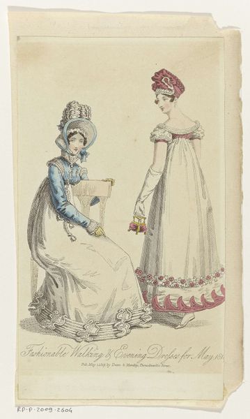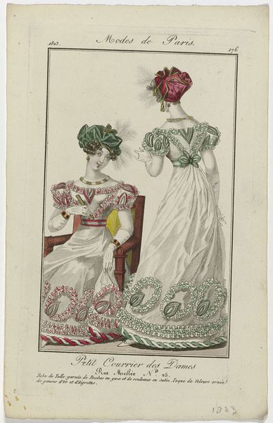 Curator: This delicate watercolor illustration, "Nouveau Journal des Dames, 1821," likely served as a fashion plate for the Parisian elite. Note the fine details in rendering the gauze cashmere robe and turban. Editor: There’s an immediate serenity to it. The muted palette and the quiet posture of the figures evoke a sense of gentle domesticity and feminine refinement. It has a distinct Rococo sensibility, a fragile and decorative ambiance. Curator: Absolutely. Beyond its surface charm, this image communicates a powerful message about societal expectations. Fashionable dress became a signifier of social standing and cultural participation, deeply intertwined with women’s identities. Editor: The composition is clever; it uses the mirrored pose of the figures to express subtle stylistic contrasts. The standing woman emphasizes the lines of the dress, while the seated woman highlights its movement and texture in relation to the musical scene. Note how their bodies form complementary arcs. Curator: And don't miss the deliberate placement of the accessories – the turbans become halos, elevating the mundane act of music-making into a realm of sophisticated ritual. These touches remind us of the period's broader artistic trends. They tie dress to character, subtly endorsing proper demeanor for the upper class. Editor: In particular, look at how the light describes the fabric of their dresses. This highlights its thin, translucent texture, emphasizing the physical ideal that they promote ––thin, demure and delicate. I appreciate how the sparseness enhances this impact; it says more by showing less. Curator: True. This work reminds me that art and clothing work together to communicate status. The woman isn’t just fashionable; she is also signaling membership within a defined, elevated community, both economically and spiritually. Editor: Reflecting on the painting as a whole, what initially appeared delicate transforms into something more calculated – a meticulous study in visual persuasion. It reminds us of the visual forces involved in identity construction.