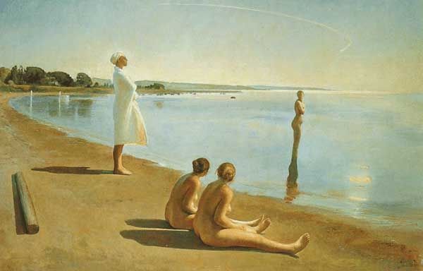 Curator: This is "On the beach" by Paul Fischer. Although it's undated, the artist worked primarily in the late 19th and early 20th centuries. Editor: Immediately, it’s the hazy light that gets me. It feels so evocative, like a memory just beyond reach. And the color palette…soft blues and creams. Curator: Indeed, Fischer's approach to light and color lends itself to the school of Impressionism. Note how the composition is structured: the subtle arrangement of figures on the sand leads our eye towards the distant horizon. The eye is directed from left to right due to the placement of the models. Editor: It reminds me of lazy summer days as a child, that kind of sun-drenched languor. The woman on the left, perched on a rock – is she comfortable or simply pensive? Her skin looks incredibly smooth due the subtle transitions. Curator: The contrast in the two figures introduces an interesting semiotic relationship. The model in the bathing suit strikes a pose of exhibitionism and modernity. While her companion's form takes the classical style more aligned with art of previous centuries. The rocks in the lower portion provide horizontal grounding elements, further reinforcing compositional stability. Editor: So much of our perspective comes down to structure, doesn't it? Yet, I wonder what the narrative is, what binds these women? Perhaps that's what the artist asks us to conjure. And you're right; Fischer masterfully marries formal structure and atmospheric impressions. The softness makes it feel like a half-remembered dream. Curator: His technique facilitates the construction of atmosphere over stringent detail, a quality shared by many landscape paintings of that era. By leaving the story incomplete, a certain ambiguity adds layers of significance to what we’re viewing. Editor: It's as if Fischer invites us to complete the painting ourselves. A moment suspended, open to infinite interpretations. "On the beach", despite its serene subject, vibrates with artistic intention. Curator: Absolutely, and its lasting impact is the open ended perspective it invites on history and form.