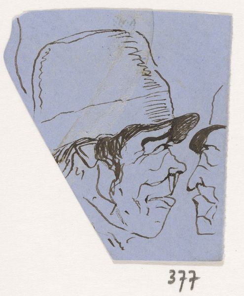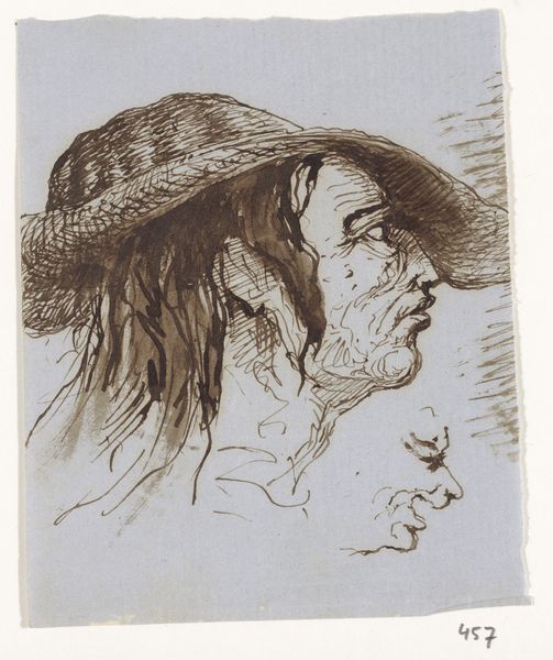 Editor: So this is "Head with Hat" by Johannes Tavenraat, sometime between 1840 and 1880. It’s an ink drawing and it gives me a strong impression of character, even caricature. What strikes you most about this piece? Curator: The starkness, and immediacy of the image resonate deeply. The hat itself… it feels almost like a crown, doesn't it? What does the hat evoke for you? Editor: A kind of… ramshackle authority? It’s like he’s claiming a status that isn’t necessarily his. The line work seems pretty unforgiving and honest to me. Curator: Precisely! Note the deep lines etched around the eyes and mouth; they carry the weight of untold stories. And how the artist juxtaposes the defined profile with the sketch of the other. Do you find the face to be aggressive? Does he wear a mask? Is he shielding his most inner self? Editor: I hadn't considered a mask. Maybe there's a bit of self-preservation there? It's almost as if the artist is commenting on the performance of self, putting on airs. It would be difficult to get close to the depicted figure, he feels protected. Curator: The 'shield' is really interesting as a way of protection, defense against something. The symbols carry a kind of cumulative emotional charge, reflecting not just the individual, but perhaps broader societal attitudes as well. Editor: So, this isn't just a portrait of a man with a hat, it’s more of a cultural commentary? Curator: Every mark, every shadow, echoes sentiments far beyond the surface, like collective cultural memory of the time. I'm glad we noticed so many emotions on this portrait.