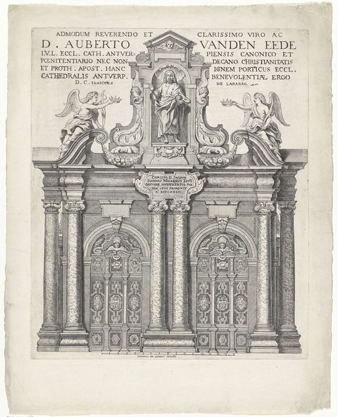Editor: We're looking at "Titel in architecturale omlijsting met wapenschild," or Title in architectural frame with coat of arms, a 1643 engraving. It seems like the title page to a history book. I'm struck by the incredibly detailed architectural surround. What historical context informs this piece, and how does it represent the times? Curator: Ah, yes. It is very much of its time. Imagine yourself back in 17th century Europe, steeped in the Baroque’s love for grandeur and theatrical display. Everything – even the cover of a book – aimed to impress. This engraving breathes the same air as Bernini’s sculptures and Rubens’ paintings, all striving for awe. And look at the incredibly dense textures—that's typical of the time. Editor: I see what you mean. It's a feast for the eyes, almost overwhelming in its detail. The pillars, the foliage, the heraldic crest... Curator: Precisely! Each element isn't merely decorative. The pillars speak to classical authority, while the coat of arms anchors it to a specific lineage and power. Think of it as a carefully constructed stage set declaring the importance of what lies within. Editor: So it's not just about aesthetics but about conveying a message? Who exactly *was* the book written about? Curator: It’s definitely a performance! And yes, this wasn't just any book—it was a history of the war in Flanders by Cardinal Bentivoglio, and the book cover emphasizes a strong connection with royalty through dedication to nobility with familial ties to the King. And notice how the Baroque aesthetic actually serves the propagandistic intent: more splendor translates to greater importance, which in turn bolsters the narrative of the war itself. What a fascinating use of power through printed image, isn't it? Editor: Absolutely. I had only considered that ornamentation for beauty's sake! Curator: My dear, in art, intention often precedes beauty. Look closer and you'll find stories within stories etched into these very lines.