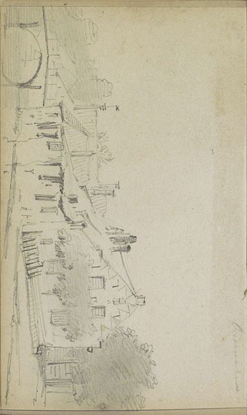 This is a design for a stage set at the Opéra in Paris, sketched by Eugène Cicéri in the 19th century. At first glance, the narrow vertical format immediately draws the eye upward, mimicking the towering architecture it depicts. The monochromatic palette, rendered in delicate pencil lines, creates a sense of depth and volume through subtle gradations of tone. We can see how the formal structure of the building is emphasized through the sharp, precise lines that define its cornices, windows, and overall silhouette. Cicéri's design embraces formalism by showcasing architectural elements as pure form, with a focus on the interplay of lines and planes to construct a convincing stage facade. The sketch is not merely representational but explores the intrinsic aesthetic qualities of architectural design itself. It reduces architecture to a visual language of line and form, suggesting that buildings, like art, can be appreciated for their abstract qualities.