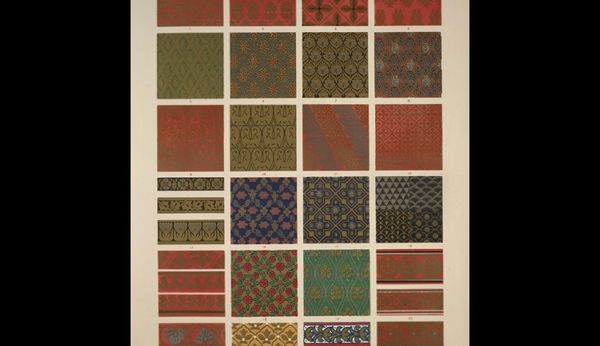 Editor: Albert Levone’s “Cotton Prints,” dating back to around 1939, feels like a sampler, doesn’t it? A study in color and rhythm with that repetitive patterning. It reminds me of old wallpaper. What's your read on it? Curator: I see echoes of a yearning for the handcrafted. Post-Depression era, perhaps, a reaching back to simpler times and more humanistic design. The recurring floral motifs, the concentric circles, and those little jewel-like droplets held within the grid, act almost like a visual mantra. It triggers a memory of how cultures throughout time and all over the world utilize patterns as protection, embellishment, and identity markers. Editor: Identity markers... in what way? Are these patterns symbolic of something specific? Curator: They might be. These repeated elements function almost like cultural codes. Think about how quilts or tapestries convey stories and communal histories through repeated symbols and motifs. How would you begin to decode them? Editor: I'm wondering if there is a deliberate use of domestic, familiar objects made 'exotic,' so they can be more easily 'consumed' by a wide array of people. Curator: Interesting idea, because Levone's patterns evoke a particular era but feel somewhat timeless, precisely for that exotic universality. It feels intimate yet mass produced...almost in opposition with itself. Editor: That makes me wonder about its relationship to commercialism at the time. Thanks for a new way to see this. Curator: And thank you. Thinking about art through your lens makes me realize the necessity of continuous re-evaluation of our collective cultural psyche and visual symbols.