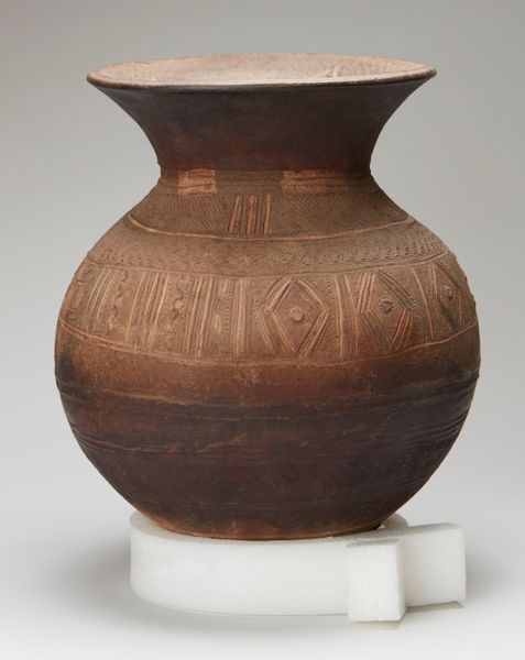 Editor: This is an earthenware vessel from the Nupe people, dating from around the 20th century. The rough texture and simple design give it such a grounded presence. What strikes me is its utilitarian aesthetic, it feels so handmade. What are your initial thoughts? Curator: I’m drawn to the labor evident in its creation. Consider the hands shaping the earthenware, the digging and preparation of the clay itself. It bridges the gap between functional object and art. How do you see its decorative elements functioning in that relationship? Editor: Well, the decorations *do* seem purposefully designed – like, adding geometric patterns. Do you think those hold cultural significance, or serve purely as surface adornment? Curator: That's precisely what a materialist perspective can unravel. Were these patterns tied to ritual use, signifying status or communicating information? Think of the pot as embedded in a larger system of production, exchange, and meaning. What tools did the artist likely use to create such detailed carvings on a curving surface? Editor: That’s true, that kind of analysis contextualizes the vessel beyond just its appearance. I wonder if the maker considered this a functional vessel or as a display item. Curator: And what determined that distinction in Nupe society at that time? Consumption patterns can be very telling. Now imagine tracing the movement of materials needed... where did the clay come from, and how was it sourced? Editor: It's incredible to consider that simple materials hold so much embedded history! Viewing art through the lens of material production makes you aware of labor conditions of artists across time and cultural identities. Curator: Exactly. We move beyond mere aesthetics, grounding the object within the networks of its making and unearthing deeper insights.