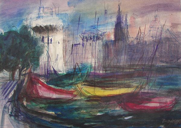 Maria Bozoky made 'The End of the Harbour' with watercolor on paper, and what I see in this piece is the joy of process. The blues and purples wash into each other, and thin lines describe boats and a distant tower. There's a light touch here, a kind of 'first thought, best thought' approach. Look at how the water is made with just a few confident strokes, or how the tower is sketched in with a few simple lines, somehow managing to suggest the weight and volume of stone. The whole thing feels so immediate, so fresh. That little cluster of trees to the right are made up of scribbled gestures, blobs of color that suggest the density of foliage. It reminds me a little of Raoul Dufy, with his quick and playful style. It's a reminder that art doesn't always need to be polished or perfect, sometimes the beauty is in the imperfection.