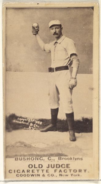 Editor: Here we have an albumen print from 1888, a baseball card of William Shenkel, a pitcher for the Milwaukee team, from the "Old Judge" series. It feels almost haunting in its simplicity, capturing a moment frozen in time. What draws your attention when you look at this piece? Curator: Beyond the simple portrait of an athlete, I see layers of cultural memory embedded within this small image. The albumen print, a popular photographic process of the time, already signifies a particular era, a specific way of seeing the world. What’s captured becomes iconic through reproduction. This particular image was used as a trade card to sell tobacco products, so we need to think about its mass appeal. Does Shenkel seem posed or heroic to you? Editor: Definitely posed, there’s a stillness to him. More of a portrait than a snapshot. Curator: Exactly. The photographer seeks to capture the essence of the “player,” someone who represented something important to a public beyond this controlled image. Then think of the cigarette brand— "Old Judge". This instantly evokes notions of wisdom, authority, a past era… layered over a young athlete promising future excitement. All within a card small enough to carry in a pocket. Editor: It’s amazing how much meaning can be packed into such a small format. I hadn't considered how intertwined the imagery is with commerce and cultural values. Curator: The baseball, held almost reverently, also functions as a symbolic object. Think of it as a stand-in for American ideals: opportunity, teamwork, healthy living... all carefully packaged. Editor: This makes me rethink how something as simple as a baseball card can be so rich in cultural and symbolic information. Curator: It is through these lenses, constantly examining symbols, that we begin to understand how meaning persists, and how our collective memories are constructed through these images.