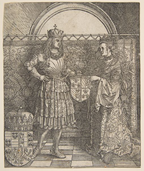Curator: I find myself drawn to the textures in this image—the stark contrast created by the black lines against the white. Editor: Indeed. This is Saint Rudolfus, a woodcut print crafted by Leonhard Beck between 1516 and 1518, dating it to the Northern Renaissance. I'm immediately struck by its rather performative air. There is Saint Rudolfus himself, positioned within a stage-like architecture; what is more, in the background, behind the saint, sits a castle high above a range of steep peaks. It strikes me as both impressive and dramatic. Curator: Agreed. The landscape backdrop coupled with what appear to be regal garments immediately read as status symbols. The artist has staged Saint Rudolfus with markers of symbolic capital, wouldn't you agree? What is interesting for me is to see it as both asserting power, whilst potentially acting as a conduit to a different symbolic system and order – as alluded to by the acronym in the flag. It seems the artwork stages complex relations and social positionality. Editor: I think it does stage this. Observe how the composition adheres to a pyramidal structure. This classical form lends the figure stability and stature; then the heraldic shield placed prominently to the left anchors the scene. Semiotically, we read this form as stable and fixed, reinforcing the idea of enduring legacy and institutional authority. I think the structure helps convey the weight of this kind of imagery. Curator: You're correct, but I read the inclusion of that heraldic shield a bit differently. It suggests, for me, an important insertion into the larger historical narrative, an insistence on situating this individual, and the values or order that he is meant to represent, within a specific lineage. What appears like this grand, sweeping, stage set historical vision can also be read, from a more grounded perspective, as about bloodline and birthright. It speaks to larger themes of legitimacy, authority and heritage. Editor: Yes, certainly. As our conversation illustrates, even within this relatively small frame, Beck’s craftsmanship yields a nuanced perspective into not just the historical and symbolic, but to our current way of understanding power, lineage, and the construction of authority. Curator: Indeed. The play between historical record, artistic intention, and subjective interpretation renders it perennially fascinating and profoundly relevant, still today.