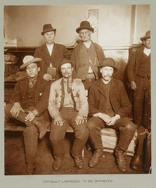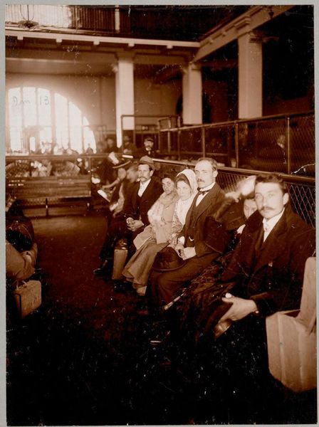 Editor: This photograph, titled "Races, Immigration," captures a large group of people at the New York Immigrant Station. The sepia tones lend a somber mood. What strikes you most about its composition? Curator: The formal arrangement is quite striking. Observe how the artist, J.H. Adams, structures the figures: a dense layering creating a complex interplay of light and shadow. Note the architectural geometry framing the subjects. Editor: That's a keen observation! I hadn't considered the interplay of the figures with their architectural surroundings. It really enhances the feeling of confinement. Curator: Indeed. The composition, beyond its representational function, evokes a sense of spatial dynamics through its tonal variations and structured forms. It's a study in contrasts. Editor: Thank you. I'm starting to see how the artist uses form to emphasize the emotional impact of the photograph. Curator: Precisely. It's a powerful demonstration of how formal elements can shape our perception.