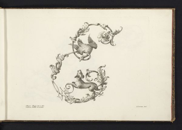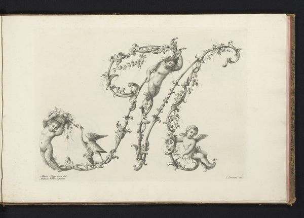 Curator: What strikes me most about this piece, "Ornamentele letter P", made between 1745 and 1765 by Lorenzo Lorenzi, is how fluid the symbolic structure appears; the initial "P" almost acts as a stage. Editor: Absolutely, and you can almost feel the scratch of the pen on paper. It seems incredibly tactile and immediate despite being nearly three centuries old. Curator: Note how the artist incorporates not just a letter but figuration; the nymph could represent any number of virtues or mythological figures; perhaps she signifies Fame. The ornate floral details intertwined are telling, suggestive of fecundity and rebirth. Editor: Exactly, thinking about it from the perspective of material and labor, I wonder if Lorenzi was preparing these as studies. Pen and ink suggest accessible materials—likely preliminary sketches toward something larger or more permanent. Curator: The dove perched within its own swirling vortex is also charged with significance – generally symbolic of peace or purity, though baroque-era symbol books frequently present a variety of connotations, layering symbolic meaning, from fidelity to simple grace. Editor: Right. And the virtuosity on display must be noted; controlling ink to achieve that range of delicate line work takes dedication. How does that craftmanship interact with the social purpose this work was meant to have? Were these for public view or were these meant as personal expressions, just as the "sketchbook" tag would suggest? Curator: Interesting point. Consider this more closely: perhaps the piece shows us something essential about both personal virtue, the cultural symbolism connected to women’s agency and beauty during this period. It makes us think what "P" might have represented for people who witnessed these designs. Editor: It really highlights that often, so much skill and intention goes into the underdrawings. Examining process can give us unexpected windows into social life. Curator: A vital insight that pushes us to reflect on material conditions to open our mind and imagine deeper layers. Editor: I find myself appreciative of these early glimpses into technique, the real-world concerns.