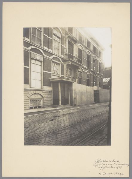 This photograph, "Gezicht op Nieuwstraat 10 te Dordrecht," was taken in January 1911 by an anonymous photographer from Monumentenzorg, the Dutch heritage agency. It's made using traditional photographic processes, capturing a street view with a focus on architectural detail. The material quality of early 20th-century photography lends the image a soft, sepia-toned aesthetic. The photograph emphasizes the brickwork of the buildings, highlighting the craftsmanship involved in their construction, brick by brick. You can almost feel the weight and texture of the bricks, and imagine the labor of the masons who laid them. The social context is also embedded in this image: the very act of documenting these buildings reflects a growing awareness of architectural heritage. By focusing on the material and construction of the building, the photograph invites us to consider the broader cultural and social values attached to craft and the built environment. This reminds us that photography itself can be a tool for valuing and preserving cultural history, challenging traditional distinctions between art and documentation.