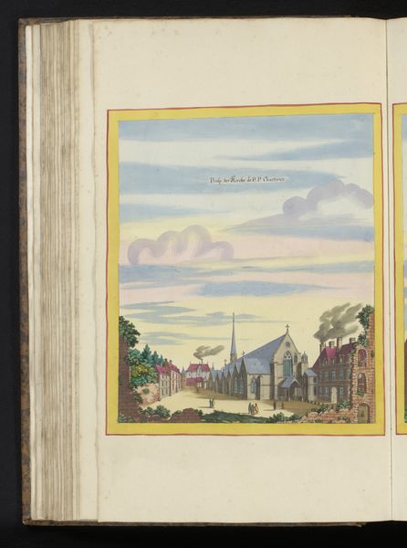 Curator: Here we have "View of the Orangery and a Gate at Château du Val de Ruel," a watercolour painting rendered around 1655 by Matthäus Merian the Younger. It’s currently held here at the Rijksmuseum. What leaps out at you? Editor: It's pastel perfection. Like a memory fading into a gentle dream. The tones are so soft. It's airy, light, a touch melancholy, maybe? Like a postcard from a summer long past. Curator: That melancholic aspect might arise from what the chateau represents. Places like Val de Ruel were statements of power, reflections of the owner’s ambitions expressed through symbolic architecture and formally arranged grounds. These landscapes evoke idealized visions, projecting stability. Editor: Absolutely. The architecture itself feels loaded. We have a classical arcade meeting a triumphal arch—symbols that connect back to Roman power. Curator: Exactly, that’s that cultural memory bubbling up. Architects frequently utilized Classical orders to reinforce ideas of power, legitimacy, and order in a newly defined space. Merian captured a specific, idealized worldview embedded in those stones. Editor: And the soft watercolor palette seems almost subversive, a way to defuse the grandiosity. I find the people charmingly miniature. I think the real drama here exists above the horizon. The clouds resemble purple puffs, almost comically placed. The painting seems almost playful in the execution! Curator: Interesting…Perhaps Merian was capturing not just the château itself, but the ephemerality of its moment. Buildings are static, stone by stone, but social and political power…much like watercolor pigment, that’s always shifting and subject to change. Editor: I appreciate how looking closely shifts your perspective on these historical monuments, how they become deeply personal. You discover a narrative much more complex than power, but human presence within that sphere. Curator: Beautifully put. When we engage with art, especially artworks imbued with a potent sense of time and space, the story becomes more than lines on the paper or the strokes on a canvas; It represents how far we have evolved and what still holds strong for us.