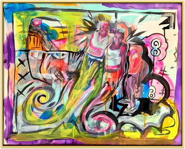 David Michael Hinnebusch made "Brin and Glare at It" with what looks like acrylic or maybe oil, and a whole lotta energy! The colours kinda explode, don't they? A big gloopy mess, but somehow it works. You can almost feel Hinnebusch just letting loose, letting the paint do its thing. I love how raw and immediate this piece feels. The paint is slapped on, thick in some places, thin and drippy in others. There's a real physicality to it, like you could reach out and touch the textures. Look at that big black outline, like it's holding everything together, just barely! It makes me think of, like, a wild Cy Twombly, but with more teeth! "Brin and Glare at It" doesn't try to be pretty or perfect. It's messy, it's loud, and it's full of life. And that, to me, is what makes it so damn interesting.
