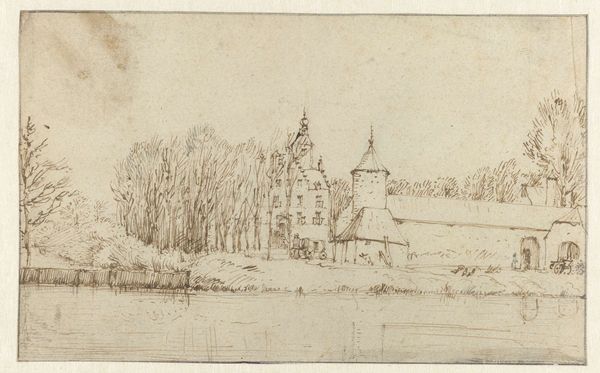 Editor: Here we have "Huis te Middachten," a drawing, potentially an etching as well, by Constantijn Huygens II, dating back to possibly 1676. It feels like quite a simple landscape, very understated in its presentation of what appears to be a stately home. How do you interpret this work, considering its place in the 17th century? Curator: This image gives us a window into the Dutch Golden Age, but it's a very particular window. The etching’s seeming simplicity actually points to important shifts in how landscapes, and especially estates, were being depicted. Think about the role country estates played, not just as residences, but as symbols of power, wealth, and social standing. Huygens wasn't just recording the house; he was participating in constructing an image of it. Editor: So, it’s less about faithful representation and more about projecting a certain ideal? Curator: Precisely. This drawing serves as a form of visual rhetoric. What is omitted is as crucial as what is shown. Look at the angle – not imposing or dramatic, but domestic, calm, ordered. This would appeal to a specific kind of patron invested in maintaining a specific status. How might the socio-political climate of the Dutch Republic in that period, marked by its mercantile power and nascent colonialism, influence the creation and reception of such an image? Editor: So, viewing it as more than just a landscape reframes it in quite an interesting light; the context becomes crucial. It reflects ideas about class, power, and the self-image the Dutch were keen to project. Curator: Exactly. Understanding that helps us see beyond just lines on paper; we see the political landscape, quite literally. Editor: That’s a fantastic perspective; I'll definitely carry that into future viewings of similar artworks.