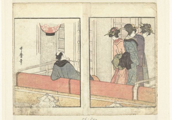 Editor: This is a print by Utagawa Toyohiro, titled "Procession of Women Carrying Palanquin". I’m struck by the stillness, the quietness of the scene. What do you see in this piece? Curator: For me, it’s about that moment of suspension. The weight of the palanquin, both literal and metaphorical. How the woman bearing the weight is composed; the man inside looks like he is expecting something; this print is like a fleeting dream. Editor: A dream? Curator: Yes, don't you think so? The colors are so dream-like, the composition feels a little off. It's really striking, isn’t it? I'm left wondering about who these people are, their stories. Editor: It is! I never thought about it that way; this has been really insightful, thank you!