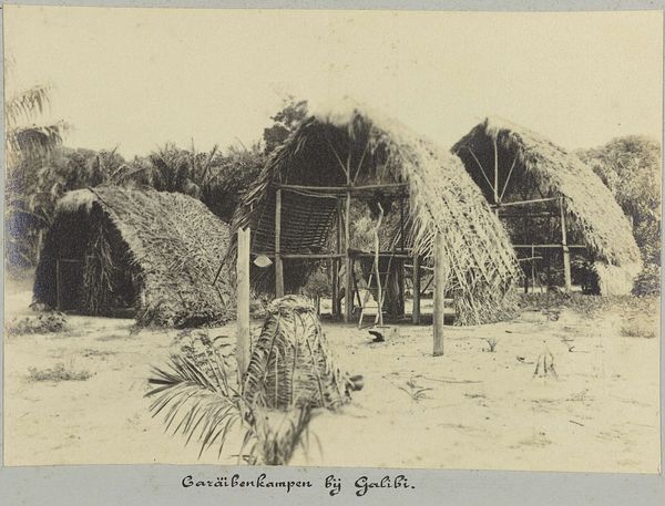 Curator: This albumen print, entitled "Kinderen voor een woning bij Galibi, Suriname," was taken sometime between 1903 and 1910 by Hendrik Doijer. The scene feels remarkably immediate. Editor: It has a certain gravity. Despite the rustic nature of the dwelling, the children stand with a composed, almost stately air. It really feels timeless, a window into a very particular culture. Curator: Right. The production process of an albumen print would've involved coating paper with egg white and silver nitrate, exposing it through a negative, and then toning and fixing. These were often used for documentary or ethnographic purposes. Doijer was keen on representing indigenous cultures of Suriname, reflecting the social currents and scientific interest in different ethnic groups at the turn of the century. Editor: You can almost smell the thatch from the roof. The photograph serves not only as a record of these structures and individuals, but also transmits a sense of the vernacular; the specific culture rooted in that time and space. Consider the house, which projects as a large enveloping symbol that could connote shelter, community, and ancestry. Curator: Indeed. What I find compelling is how the physical properties of the photograph speak to larger themes of labor, resource management, and colonial power. Look closely—you can observe the intricate texture of the woven thatch roof, evidencing the physical labor invested in creating shelter using local materials. These structures reveal innovative responses to the environment. Editor: The very posture of those kids also brings in nuances to the picture. One stands seemingly older, and maybe even protective. Their presence certainly creates narrative possibilities; about kinship, upbringing and life in Suriname back in those times. Curator: Well, by focusing on the labor, the materials, and the conditions under which this image was created, we can enrich our understanding of indigenous societies, resist simplistic romanticizations and move towards a more nuanced understanding of indigenous cultures. Editor: Seeing this work definitely underscored how symbols manifest within our realities—architecture and portraiture blend here, communicating both immediate facts as well as cultural depths.