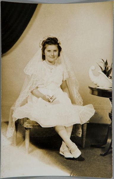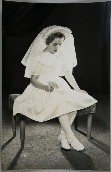 Curator: This photograph by John Deusing captures a young woman seated, holding a book, her smile radiant. It evokes such a sense of quiet confidence, almost a posed innocence. Editor: It does, doesn't it? The corsage and her overall posture speak volumes about societal expectations placed on young women at the time. Curator: Precisely. The image itself can be viewed as a study of the performative aspects of femininity, the book perhaps a subtle nod towards intellectual pursuits coexisting with social graces. Editor: I wonder about the institutional forces at play here, though. Was this a private commission, or part of a larger series exploring youth and identity? The photograph’s public role would drastically alter its meaning. Curator: It is something to consider. Either way, the picture serves as a cultural artifact, prompting us to reflect on the historical context that shaped both the subject and its reception. Editor: Absolutely, and as a visual record, it encourages us to unpack the complex interplay between individual agency and social constraints. Curator: It's images like this that remind us that art history is never just about the image itself, but the web of influences around it. Editor: A snapshot in time, indeed, that compels us to look beyond the surface.
