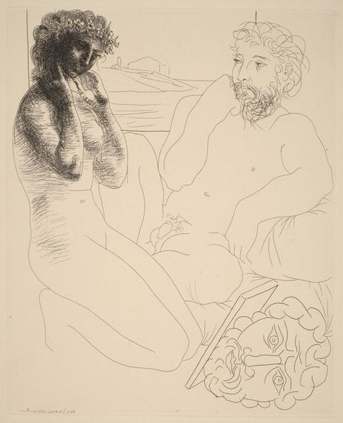 Editor: This is "Two Sculptors before a Statue" by Pablo Picasso, made in 1931. It's an intaglio print, an etching specifically, so we're seeing the incised lines of the image left by the artist. There is a fascinating contrast between the static pose of the seated sculptor, and the seeming motion of the statue he beholds. How would you interpret the material choices and subject matter? Curator: To me, it's interesting how Picasso engages with the very act of artistic creation. It's an etching, a medium inherently tied to reproduction and dissemination. What does it mean to depict sculptors, those who work materially to create unique objects, using a medium of multiples? Is he elevating printmaking by associating it with the traditional fine arts, or perhaps questioning the boundaries between high art and craft? Editor: That’s a really insightful question. I hadn't considered the implications of the medium itself. It highlights how the artist's hand, the labor involved, becomes mediated through the printing process. Curator: Exactly. Think about the physical act of etching - the pressure, the chemicals, the repetitive motions. It connects Picasso, in a way, to the artisans and workers involved in mass production. It challenges this romantic idea of the artist as a lone genius. The image within the print depicts the sculptors as classical archetypes almost… yet it's rendered using an industrial method of replication, creating a tension between artistic vision and the means of its distribution. Where do you think he lies on the spectrum? Editor: I think he's purposefully blurring that line. By depicting sculptors in a reproductive medium, he acknowledges the impact of production on the art itself. The creative action, and who it is meant for. Curator: Agreed. It’s a great piece to consider the implications of materiality and process. These historical echoes of industrial production and social history resonate with how we consume art today. Editor: This conversation has given me a lot to think about, especially the connection between artistic labor and the final art object we often appreciate in a detached way.