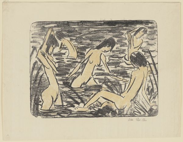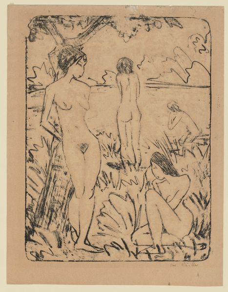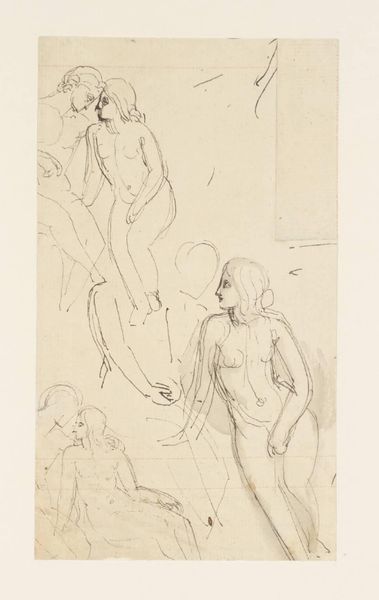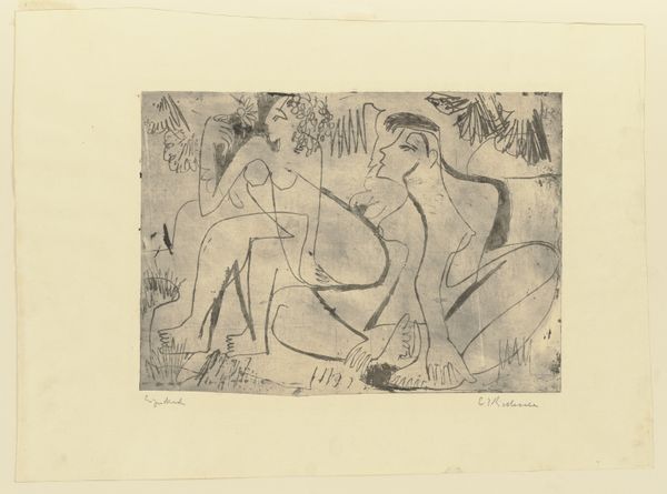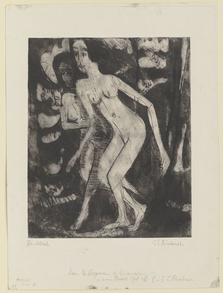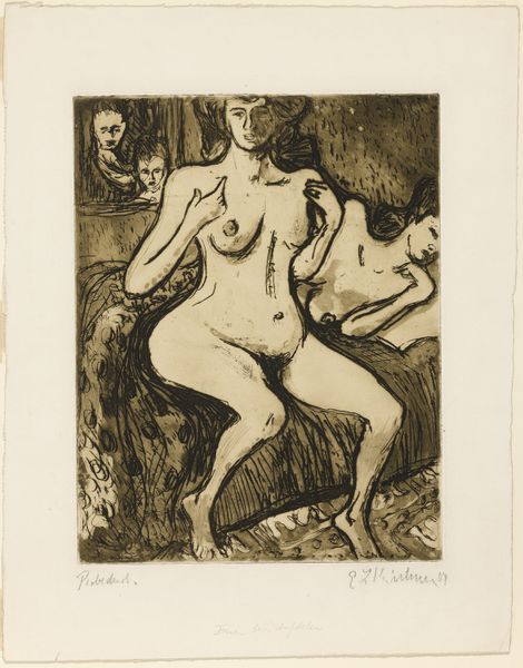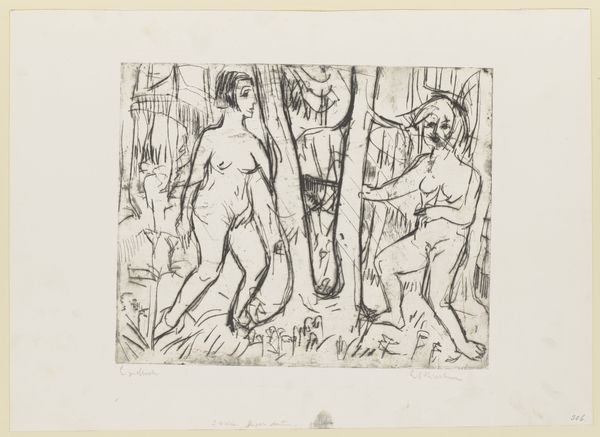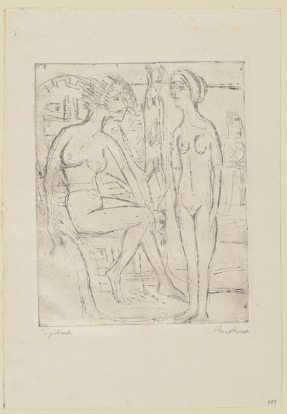 Editor: So, here we have Ernst Ludwig Kirchner’s 1923 etching, "Nackte Mädchen," or "Naked Girls," at the Städel Museum. It's stark and angular. The women seem isolated, even in each other's presence. How do you interpret this work? Curator: The etching needs to be seen within the context of Kirchner’s post-war anxieties. He struggled with mental health and addiction and withdrew to Switzerland. Notice how the primitivism, which was such a powerful mode for the Expressionists before the war, takes on a different valence here. It seems less celebratory and more haunted, doesn't it? Editor: Haunted, yes. The lines are so raw and scratchy, it gives the impression that he’s actively struggling to make peace with something. Are the figures in conversation with established canon around representing the female nude? Curator: Absolutely. Traditionally, nudes have been rendered passive, objects of the male gaze. But look at these women: they're not overtly sexualized. The seated figure stares directly outward, confronting the viewer, challenging those power dynamics. Also, how do we interpret "history painting" for Kirchner? Editor: Well, it doesn’t necessarily illustrate a specific historical event, but… could the style, that Expressionist anxiety, itself represent a response to the trauma of World War I? Almost like the emotional landscape *becomes* the history? Curator: Precisely! The emotional fallout *is* the history. The rawness and the figures' disconnection…they become a testament to the shattering impact of the war on the individual psyche, particularly artists like Kirchner. Editor: That makes the work much more powerful and definitely sheds new light on my first impressions. Thank you. Curator: My pleasure. It's by understanding the historical context that we are empowered to see its complexities.