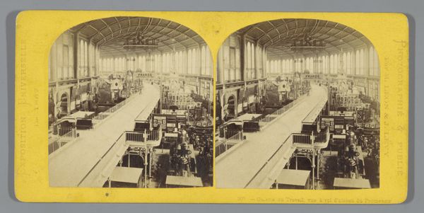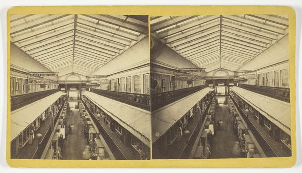 Editor: This is G.W. Pach’s "Interieur van de Pomerania", made sometime between 1871 and 1877. It appears to be a photograph, maybe even a photomontage? The scene is very symmetrical and seems to depict the inside of a train car. What social dynamics might be at play within such an enclosed, moving space? Curator: That's a keen observation. Given the historical context, consider this image as a window into the burgeoning age of travel and its impact on social classes. Railroad cars like this were essentially mobile social stages. Who had access to this train? Editor: I imagine it catered to a specific clientele…wealthier individuals, perhaps? Curator: Precisely. Transportation during this period was highly segregated by class. Pach's photograph inadvertently captures the exclusivity and privilege associated with railway travel. We also see the ways industrialization created specific aesthetic expectations. How does the symmetry impact your understanding? Editor: The symmetry creates a sense of order and control, almost like an assembly line turned luxury transport. Is it also commenting on anxieties related to social mobility or lack thereof during the period? Curator: It very well could. Art often reflects the unsaid. By presenting us with this scene, Pach invites us to contemplate the invisible walls constructed within society – walls of class, access, and mobility. Editor: I never considered how something seemingly so simple as a train interior could reveal such complex social issues. Thanks, I will look into it more. Curator: And remember, the image itself, as a reproduced artifact, participates in broader questions about accessibility and circulation. These photographs were commodities in their own right. Always consider the photograph’s place in this network!