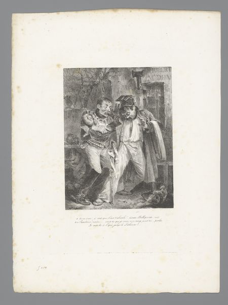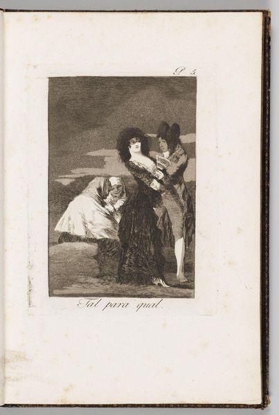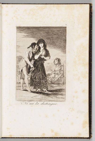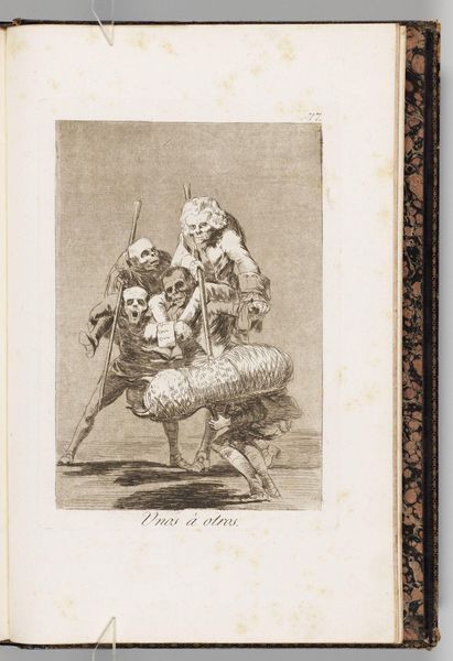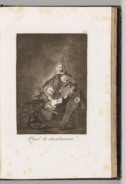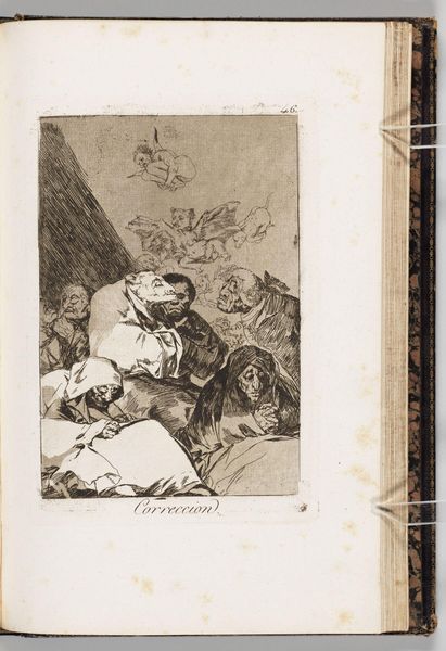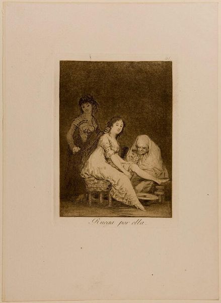 Curator: Here we have Goya’s unsettling print, titled "Blow," housed here at the Harvard Art Museums. Editor: There's a raw, almost brutal quality to the line work. The etching technique creates a stark contrast between light and shadow, enhancing the grotesque imagery. Curator: Absolutely. Goya often used printmaking to address societal ills and political corruption. This work, like many from "Los Caprichos," critiques superstition and the abuse of power, depicting an act performed to supposedly cure children, but looking like it's something far more sinister. Editor: The figures are rendered with a deliberate roughness, emphasizing their vulnerability and the grim reality of the scene. It's all about the materiality of the line, the biting of the acid on the plate to convey a visceral sense of injustice. Curator: True. It is a condemnation of oppressive social structures and beliefs. It evokes a deep sense of unease, forcing us to confront uncomfortable truths about humanity's capacity for cruelty and exploitation, particularly of the most vulnerable. Editor: It's a powerful reminder of how artistic processes can be harnessed to make visible some of the most disturbing corners of the human experience.