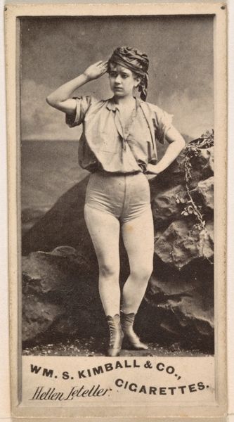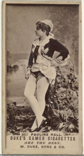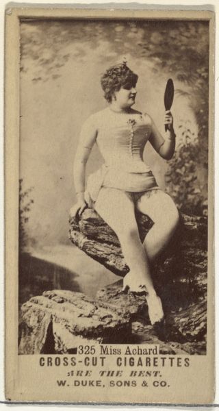 Editor: Here we have “Card Number 223, Mlle. Hartwig,” a photographic print from the 1880s by W. Duke, Sons & Co., originally a cigarette card. There's a certain charm to the image, but also something that feels staged about it, like it’s trying to project a specific ideal of femininity. What do you see when you look at this piece? Curator: I see a powerful collision of commerce and representation. This wasn't just a portrait; it was a carefully constructed image designed to sell cigarettes. Think about the power dynamics at play. Here's Mlle. Hartwig, likely an actress, her image used to entice consumers. How much agency did she truly have in how she was portrayed? And what message was this sending to the consumer, likely a man, about women and their roles? Editor: So, it's less about the individual and more about the societal message it's conveying? Curator: Exactly! We must consider that these images shaped perceptions. The actress, in her bathing costume, is objectified, transformed into a commodity herself. It contributes to a culture of seeing women as primarily objects of desire and consumption. It's critical to understand the historical context and how these seemingly harmless images were actually tools in perpetuating certain power structures. Does it change your perception knowing the original purpose of the image? Editor: It really does. It's unsettling to think about how easily these images normalized those ideas back then. Curator: Precisely. Recognizing that commercial imagery contributes to shaping norms—regarding gender, race, and class—is crucial for any meaningful study of art history. These cards, mass-produced and widely distributed, became instruments of cultural influence. Editor: This definitely gave me a lot to consider. I now see how important it is to think about the societal context, the motivation behind the image, when trying to understand an artwork like this.