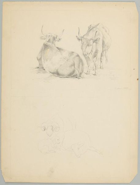 Johan Thomas Lundbye created this delicate drawing, "Et æsel malkes, mens føllet forsøger at patte," using pen and ink on paper. Immediately striking is the stark contrast between the concentrated lines forming the figures and the relative emptiness of the background, drawing us into the intimate scene. Lundbye masterfully employs line to define form and texture. The short, repeated strokes create a sense of depth and volume, particularly in the rendering of the animals' bodies and the man's clothing. Consider how the artist uses line weight to differentiate between foreground and background, adding to the drawing's depth and perspective. The overall effect is one of understated realism, hinting at the artist’s interest in capturing fleeting moments of everyday life. This drawing can be seen as part of a broader cultural interest in agrarian life during the 19th century. Lundbye’s emphasis on the simplicity and naturalness of the scene invites reflection on our relationship with the natural world. Note the absence of strong emotions. This is consistent with a broader aesthetic shift towards valuing direct observation.