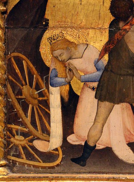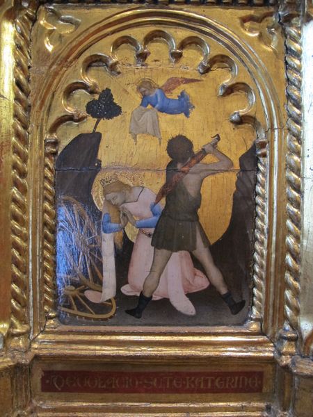 Curator: Let's turn our attention to this striking panel: "Martirio di S. Caterina" by Giovanni da Milano, created around 1355, executed in tempera and gouache. What's your initial reaction? Editor: It's intensely dramatic, isn’t it? The colors are so vibrant, almost clashing with the scene's violence. It feels like a dream, a strange, heightened moment plucked from a brutal reality. Curator: The luminosity is certainly striking, and that intense gilding would have signaled immense value and divine association to its original audience. The labor in creating the pigments, grinding them, applying the gold leaf – it’s all part of the artwork’s message. Editor: Absolutely. But also, there’s something almost... stagey about it? The executioner's pose feels performative, and the angel, poised with the cloth, seems oddly detached from the carnage. Curator: That sense of removal could reflect the social distance between the patron, commissioner, and even the artist, and the subject of Catherine's martyrdom. Who exactly was consuming these images and what did Catherine represent to them? It invites contemplation on the political and religious motivations behind such commissions during the Italian Renaissance. Editor: You're right, I suppose. Looking at the way her wheel of torture is actively broken while the angel moves in, there's this very theatrical saving moment right when its needed. So, maybe its for optimism amidst hardship? Curator: Possibly, or perhaps it underscores the institution's perceived authority by vividly portraying its divine sanction, while depicting themes of justice and righteousness in relation to historical and religious power structures. The meticulousness with which Giovanni rendered this makes us appreciate how medieval art was truly an expression of status and devotion, both through labor and subject matter. Editor: You know, thinking about that status…the flatness and the focus on pure, radiant color suddenly reads as power. A flattened world reflecting a flattened hierarchy with saintly hope reigning over all! Curator: Precisely. A compelling way to sum up its impact. Thanks for illuminating the deeper facets with me today. Editor: My pleasure! There’s always so much more beneath the surface, isn’t there?