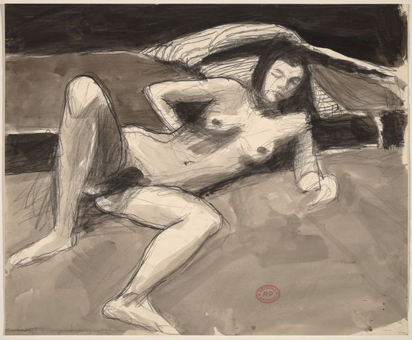 Curator: We are looking at Richard Diebenkorn’s “Untitled [female nude looking left] [recto],” likely created between 1955 and 1967. The medium is ink on paper. What are your initial impressions? Editor: Moody, intense. The stark contrast really grabs you, doesn’t it? It's like she's emerging from a dream, or maybe sinking into one. The artist has captured her stillness as an intimate observation, without any sort of theatrics, only raw emotions. Curator: Indeed. The limited palette emphasizes form and volume through tonal variation. Consider the gestural lines that define the figure—notice the interplay between areas of precise contouring and more ambiguous, blurred edges. The composition uses both precision and some raw emotion as you noted. Editor: It's fascinating how the loose, almost scribbled lines still manage to convey such weight and depth. There’s an economy to his mark-making; a lot of information gets packed into each stroke. The figure itself is somewhat obscured with the deep shadow adding to this intense emotional quality. Curator: That economy reflects a post-Impressionist sensibility. Diebenkorn distills the essence of the subject through simplification and expressive distortion, shifting focus away from surface details to some structural essence. Semiotic structure of the representation creates visual poignancy and the deep space. Editor: Exactly! She doesn’t look conventionally beautiful, more profoundly, almost heartbreakingly real. I love the angle from which the artist observed her, making the body part of a spatial narrative. It looks like the work of someone who truly understood light. Curator: And through that understanding, Diebenkorn created something beyond a mere depiction, as in any Post-Impressionist work, it seems to present a deeply psychological state. Editor: I agree. This piece definitely lingers with you long after you turn away. Curator: A powerful testament to the dialogue between artist, subject, and medium. Editor: Yes, a reminder that art often reveals more when it whispers than when it shouts.